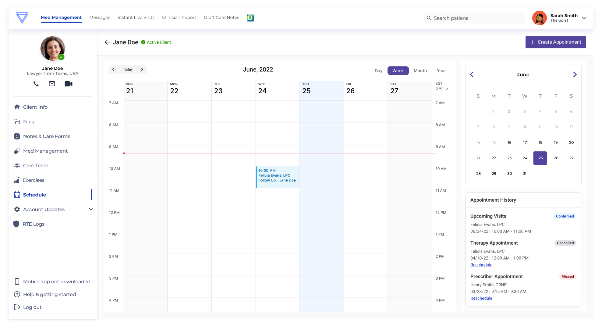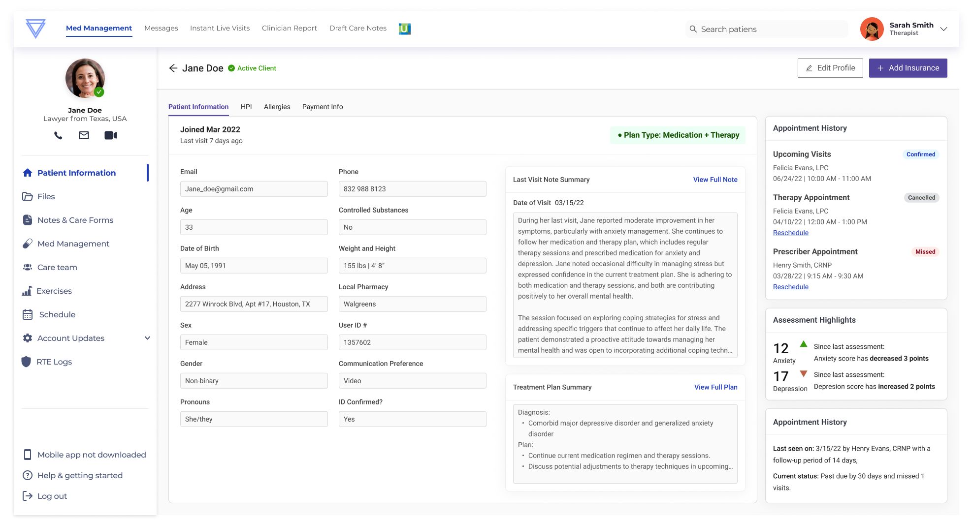 User interviews: Conducted 30-minute interviews with six therapists and 5 prescribers to understand their perspectives on patient information, EMR pain points, and visit workflows.