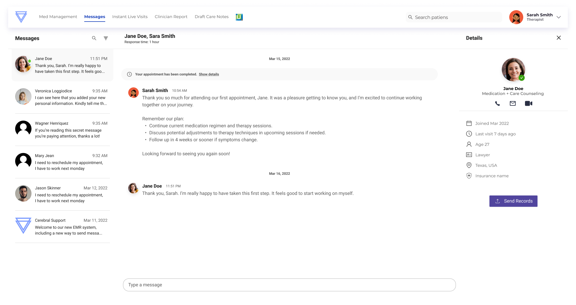 Cerebral is an online mental health platform that provides therapy and medication management for conditions such as anxiety, depression, insomnia, ADHD (in some states), PTSD, and more. The service operates through a subscription model and includes teletherapy sessions via video or phone, medication prescriptions (delivered directly or picked up at a pharmacy), and follow-up care through therapists or care counselors. The clinicians use an EMR (electronic medical record) system, which facilitates secure documentation of patient information, prescriptions, treatment progress, and communications between care teams.